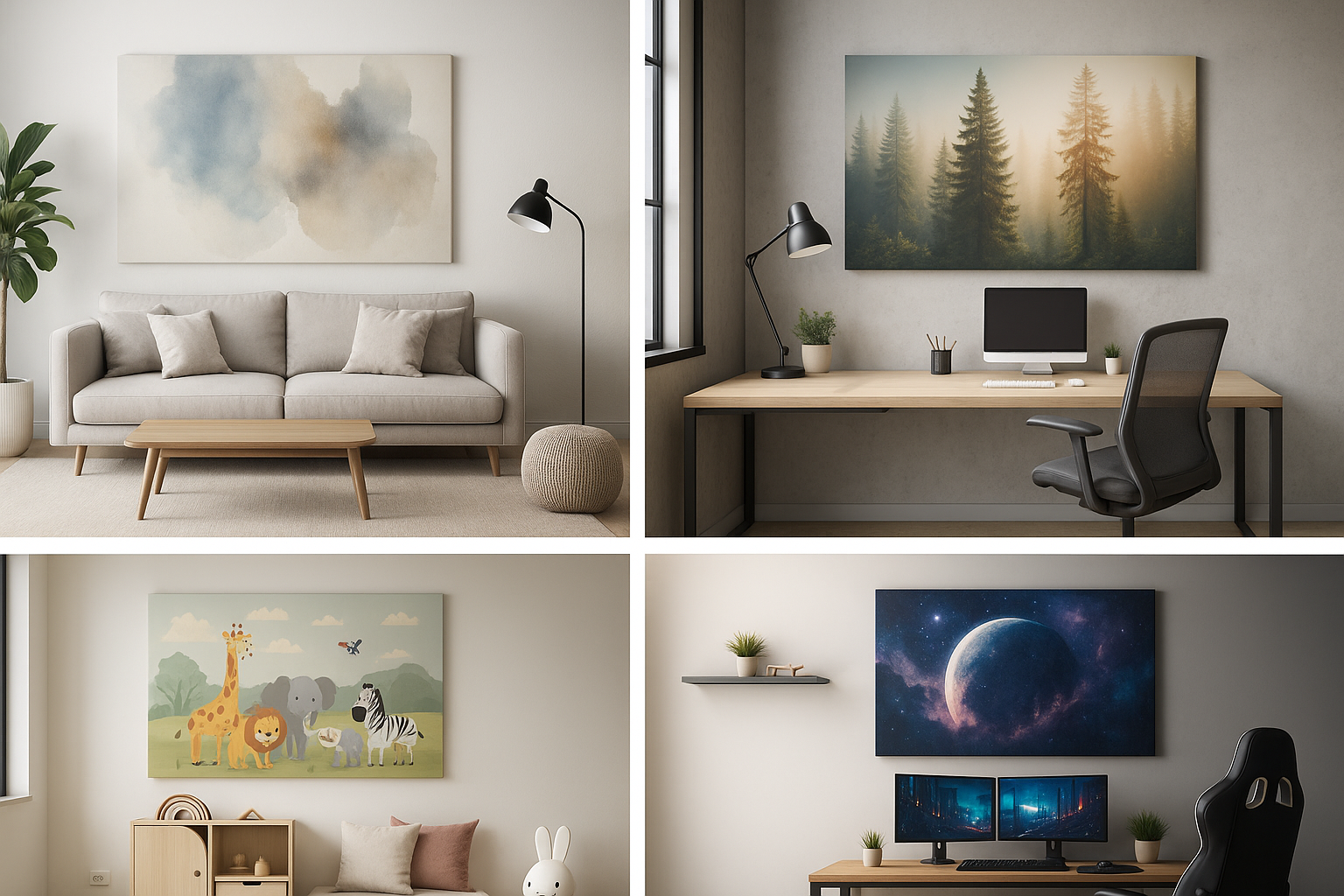 Akustikbilder setzen genau dort an, wo der Schall entsteht: an den Wänden. Unsere schallabsorbierenden Bilder nehmen störende Reflexionen aus dem Raum, reduzieren Nachhall und tragen zu einer angenehmen Akustik bei. Gespräche werden klarer, Kinderlärm weniger dröhnend, Streaming und Gaming klingen professioneller und der Alltag wird leiser.