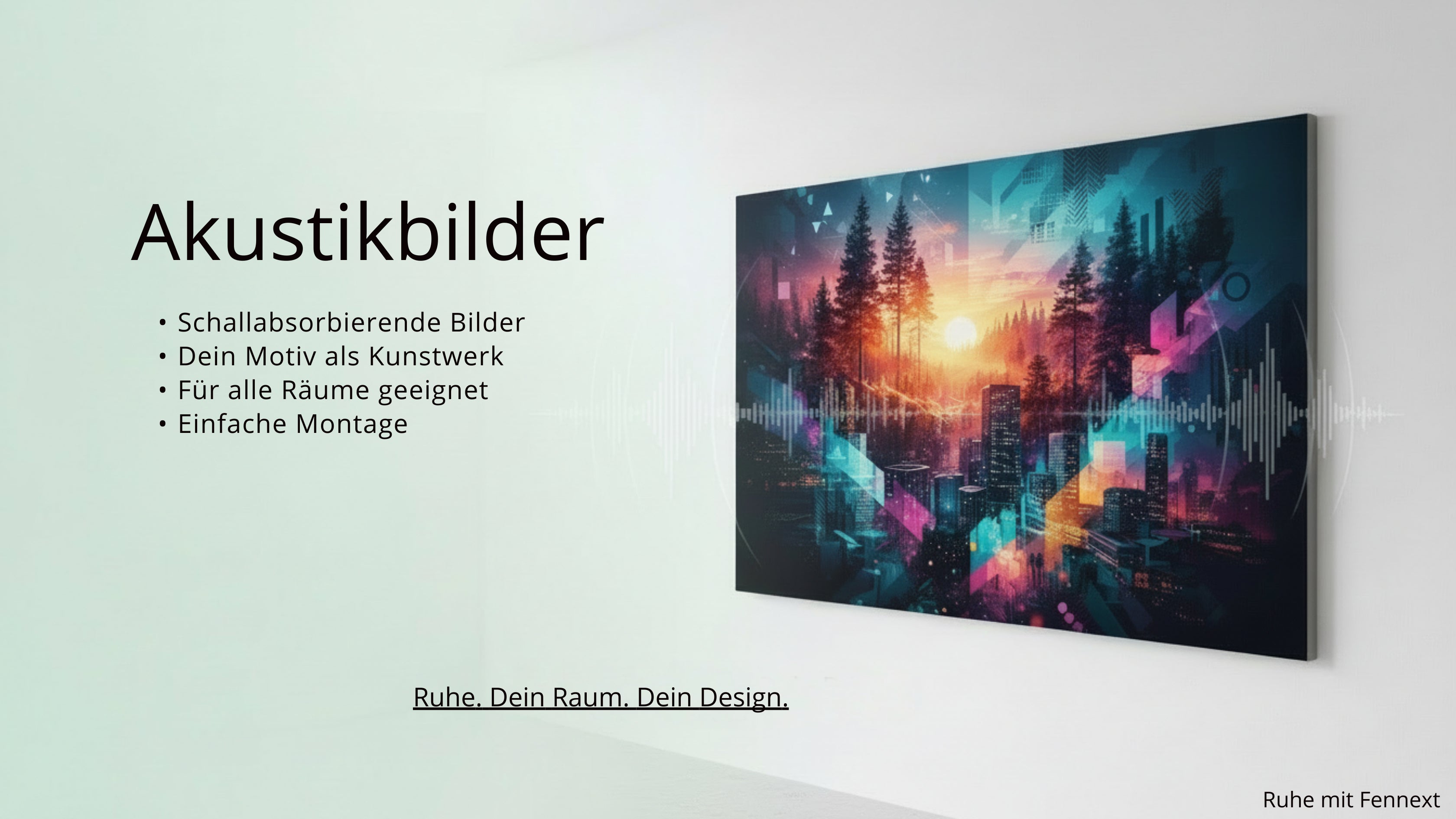 Mit FENNEXT kombinierst du wirksamen Schallschutz mit Gestaltung. Du kannst fertige Akustikbilder aus unserem Sortiment wählen oder ein individuelles Akustikbild mit eigenem Motiv als FENNEXT PIX anfragen. So entstehen Akustikbilder, die perfekt zu deiner Marke, deinem Stil und deiner Nutzung passen.