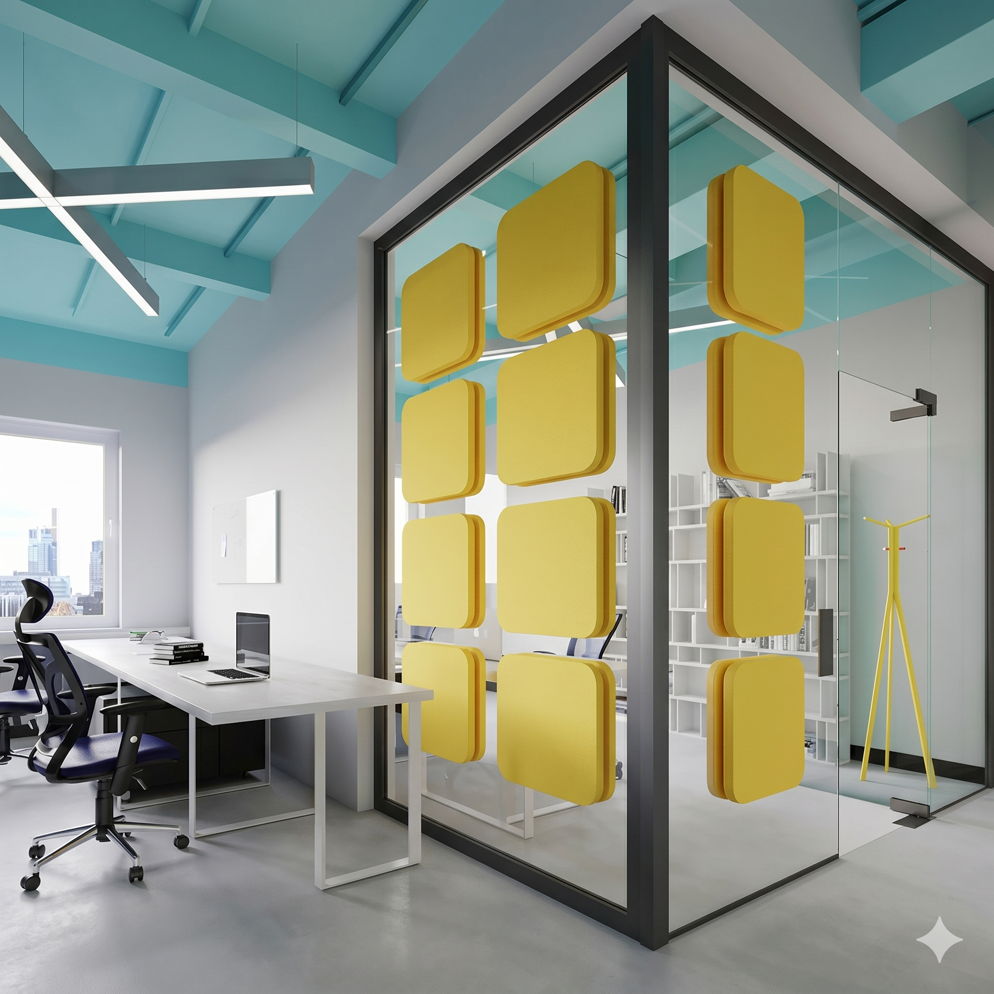 Dekorative Akustikelemente aus beflockem PUR-Schaum mit Glasoptik – kombinieren wirksame Schallabsorption mit außergewöhnlichem Design. Einfache Montage per Saugnäpfen.